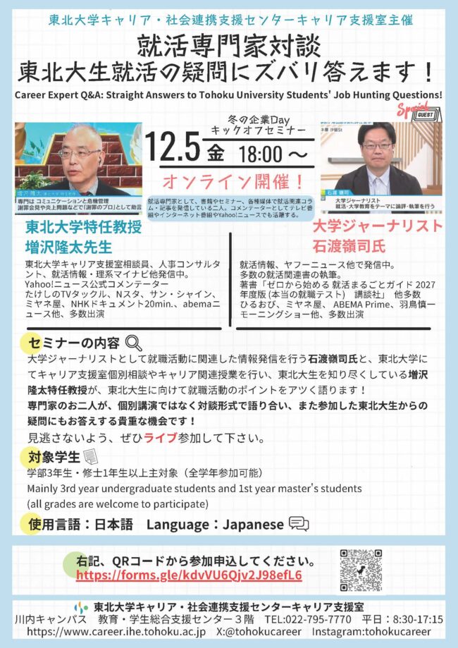 Announcement of the Event : Career Support Seminar for Tohoku University Students: ‘City Hall Work!’
